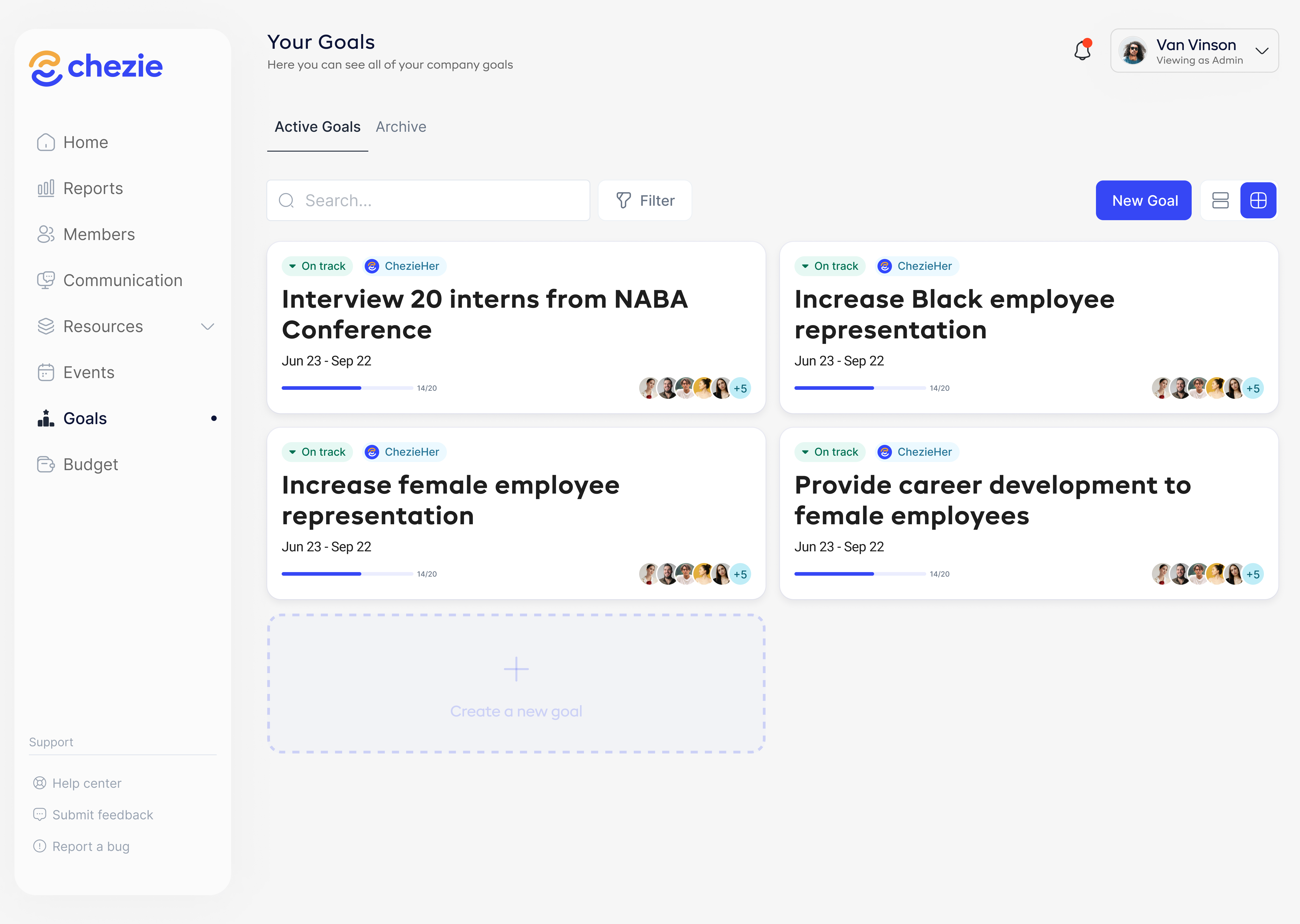 Goals enable ERG leaders and admins to track and showcase the impact of their work directly within Chezie.