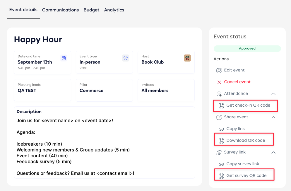 QR Codes for Surveys, In-person check-in, and event pages: Users can now generate QR codes for survey links, in-person check-in links, and event pages.